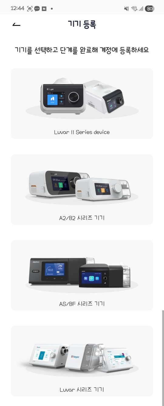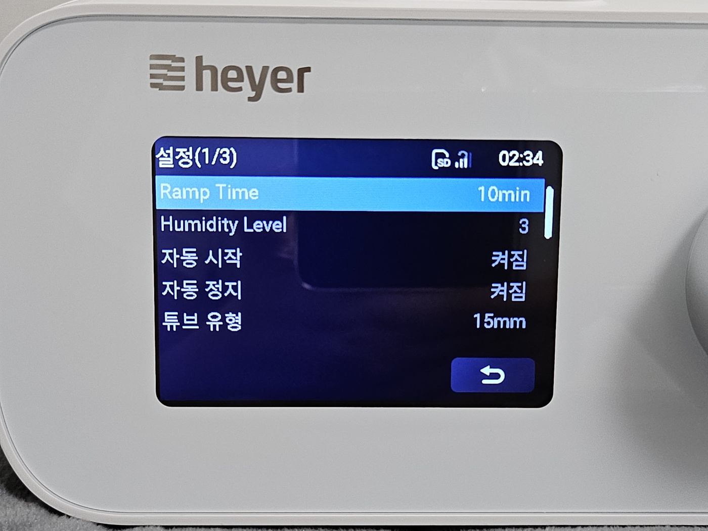 그리고 마스크 설정까지. 열선 튜브와 가습기 설정도 할 수 있는 등 모든 양압기의 설정을 손쉽게 한국어로 할 수 있습니다.