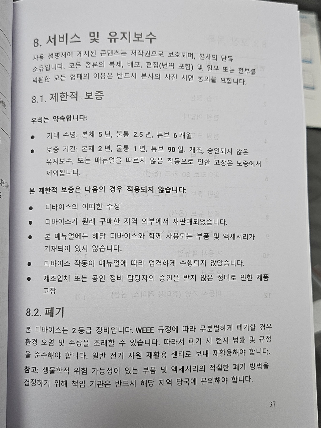 설명서에는 보증기간은 본체 2년, 물통 1년, 튜브 90일 (3개월) 보증이며