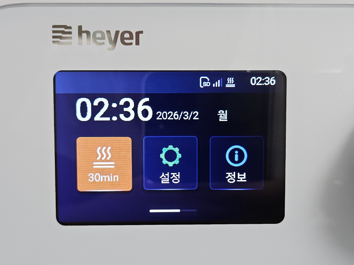 예열 기능을 활성화 시키면 예열 아이콘이 상단에 뜨면서, 30분 동안 물을 미리 데워서 바로 가습기능을 이용할 수 있게 준비됩니다.