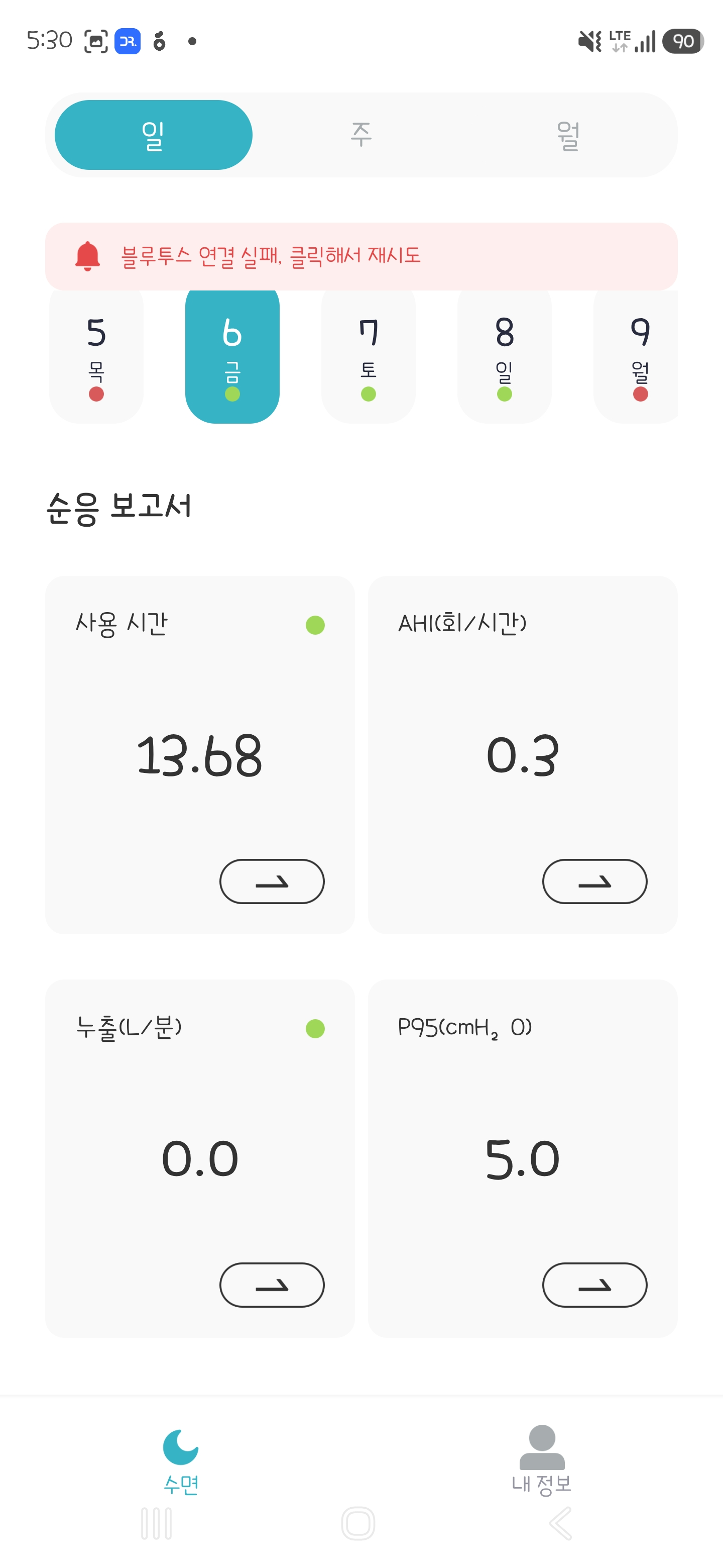위의 앱 결과를 보아도 P95 압력이 5에서 머무르는 것을 보인 것 처럼 압력의 경우 수면 무호흡을 일으키지 않을 정도로 (사용하면서 AHI 지수가 1을 넘지 않았습니다!) 똘똘하게 압력을 자동조절해주는 것이 인상적이었습니다.